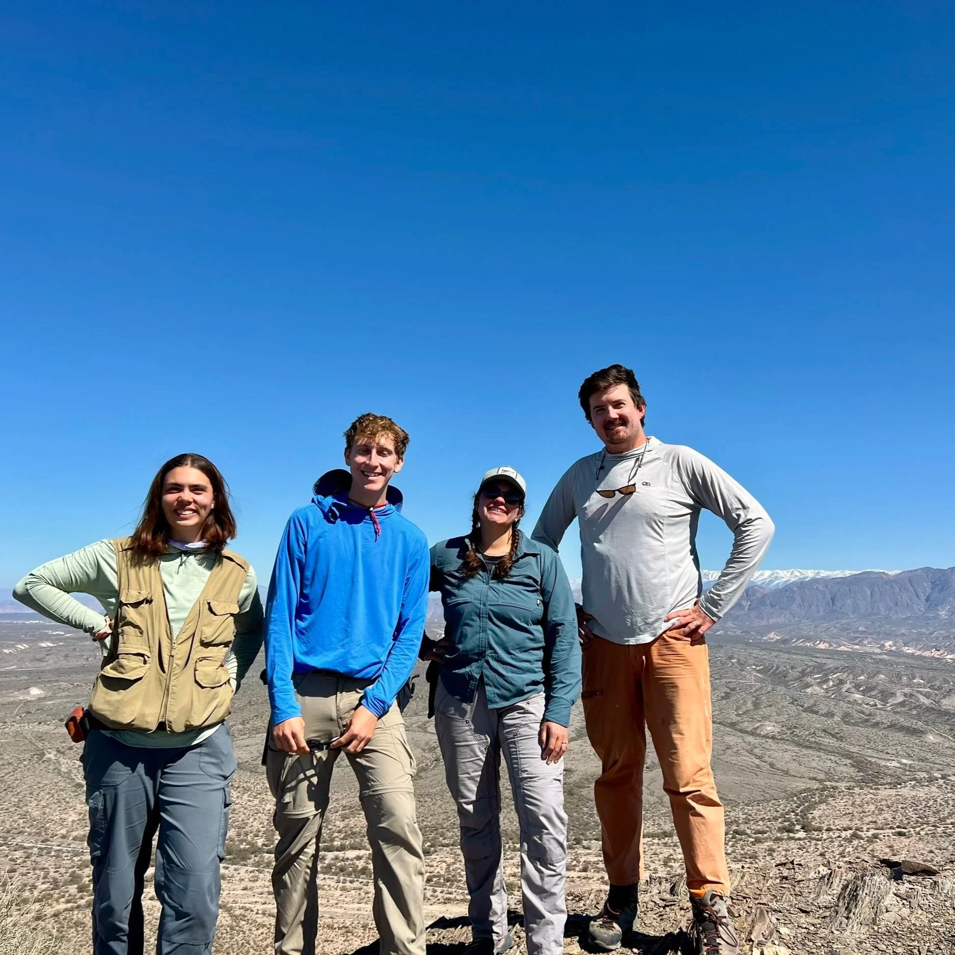 Research group standing on Cerro Valdivia on the outskirts of the city of San Juan. From left to right: Briana Pearson (PhD student), Joe Brooks-Kahn (MS student); Chloe Weeks (PhD student); Tomas Capaldi (field assistant)